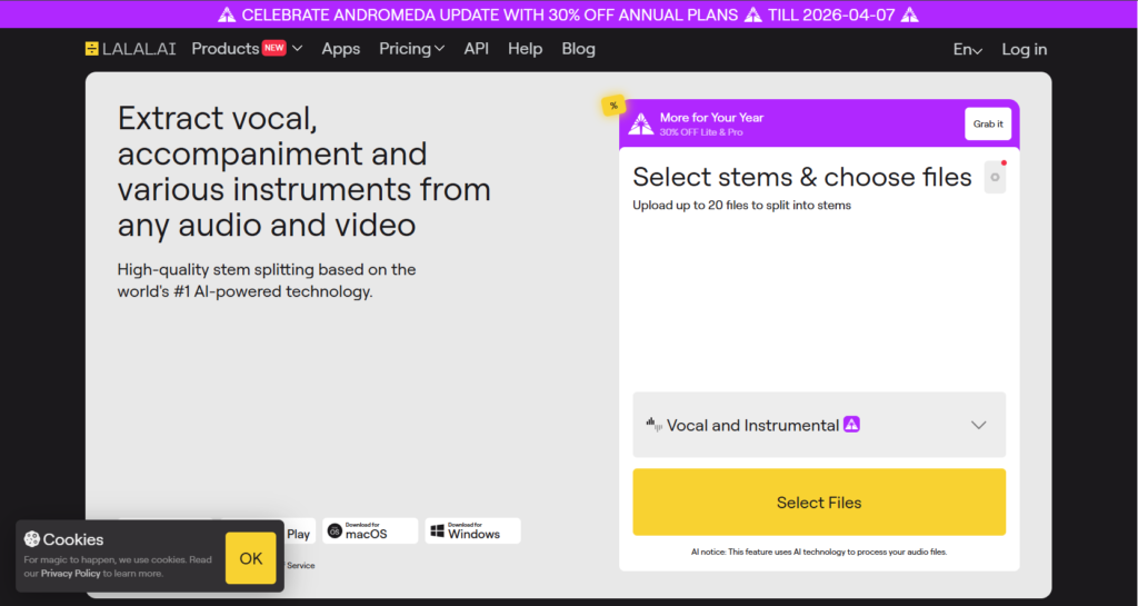 LALAL.AI separates vocals, instruments, background music, and noise from any audio file with scary accuracy. You can isolate a voice from background music, remove a noisy crowd from a recording, or extract just the beats from a song.